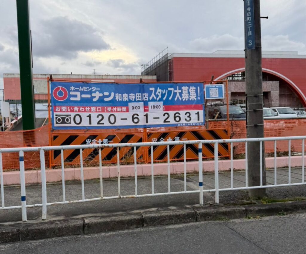 現地ではすでに工事が進められており、敷地内には「コーナン 和泉寺田店 スタッフ大募集」の看板も設置されていました。これにより、地域の方の間でも「次は何ができるのか?」と話題になっていた跡地の正体が明らかになりました。