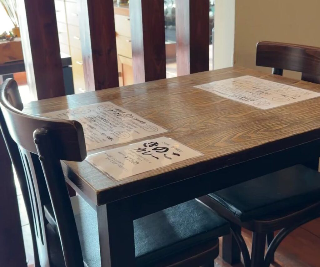 住宅街にひっそり構える、アットホームで明るいカレー専門店です。店内はテーブル席を中心にした全8席(小さめのレイアウト)で、ひとりでも入りやすいカジュアルな空間です。
