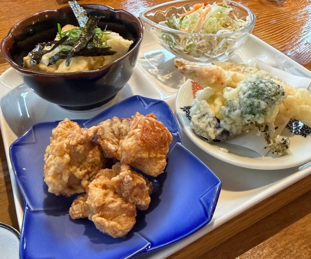 からあげ・あげだし豆腐・おまかせ天ぷらを選んだのですが、めっちゃ美味しかったです。店内は大きなテーブル席(カウンター席)と!掘りごたつ、テーブル席がありました。落ち着ける空間でほっこりするような雰囲気でした。
