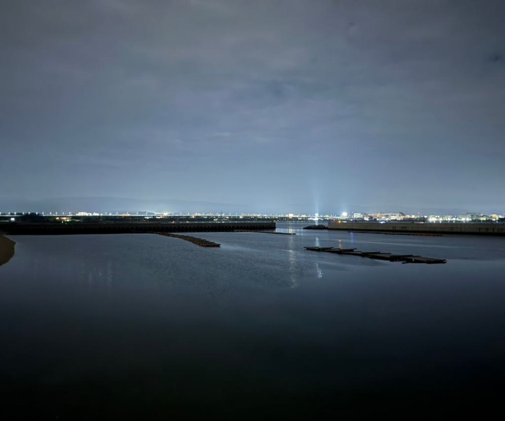 - 港側の光が海面に反射して幻想的な雰囲気