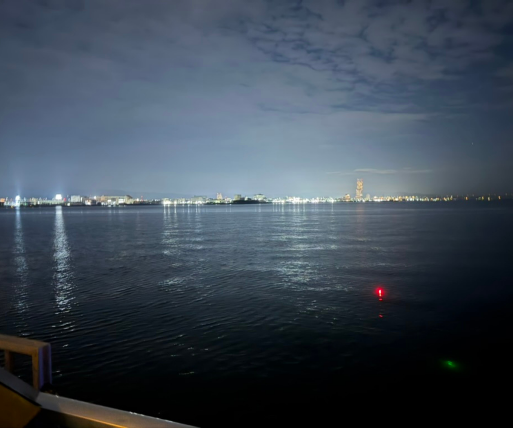 水平線へ続く港の明かりと、海に映る灯りが美しく、南大阪でも静かに夜景を楽しめるスポットを紹介します。