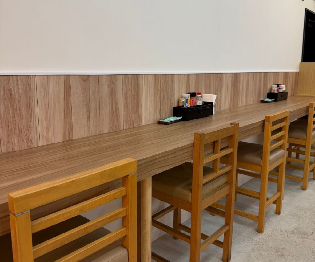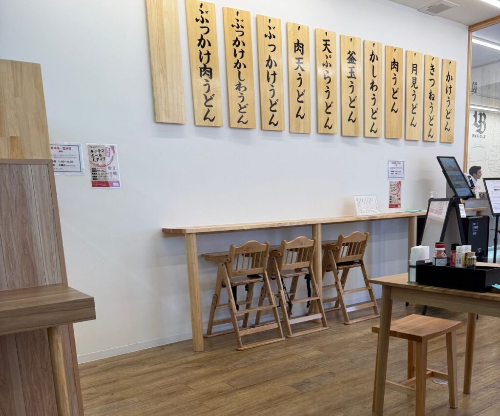 店内はテーブル席・カウンター席を中心としたシンプルで明るい空間となっています。昼はランチメインのうどん利用となるため、回転が早く、ひとり客から少人数グループまで対応しやすいレイアウト。讃岐うどんの専門店らしく、飾りすぎない落ち着いた雰囲気で、年齢問わず立ち寄りやすいのが特徴です。