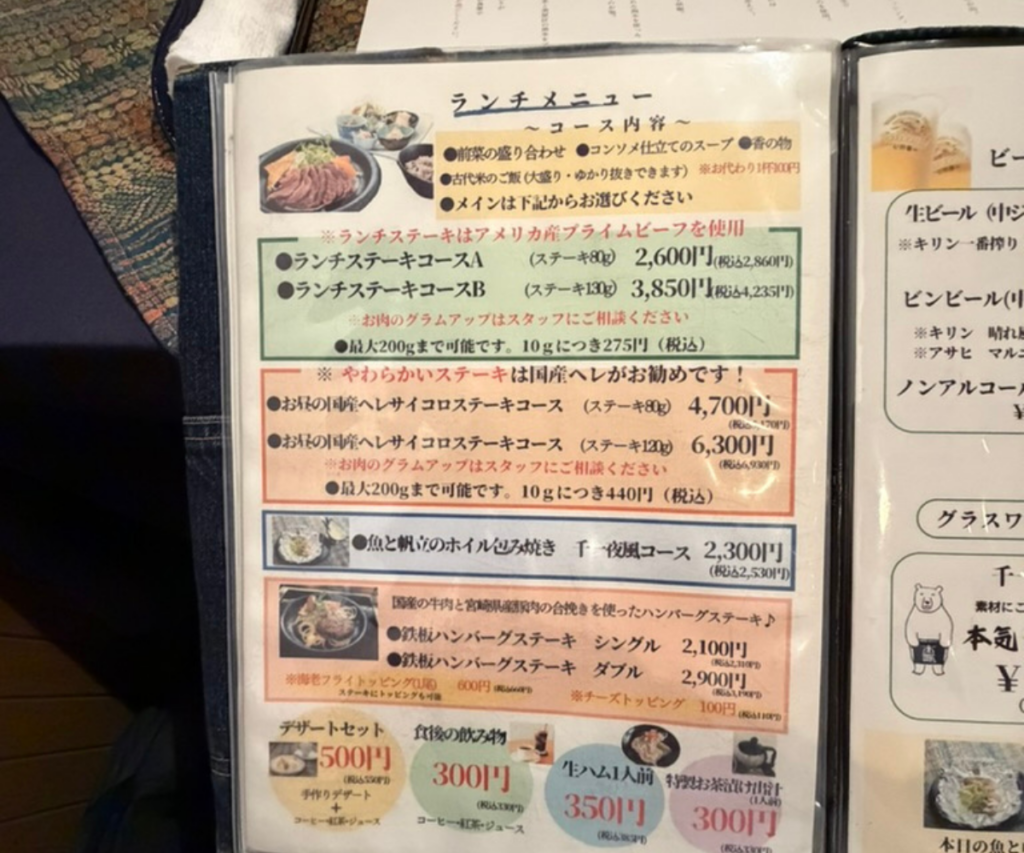 『ステーキレストラン 千一夜』で頼んだメニュー