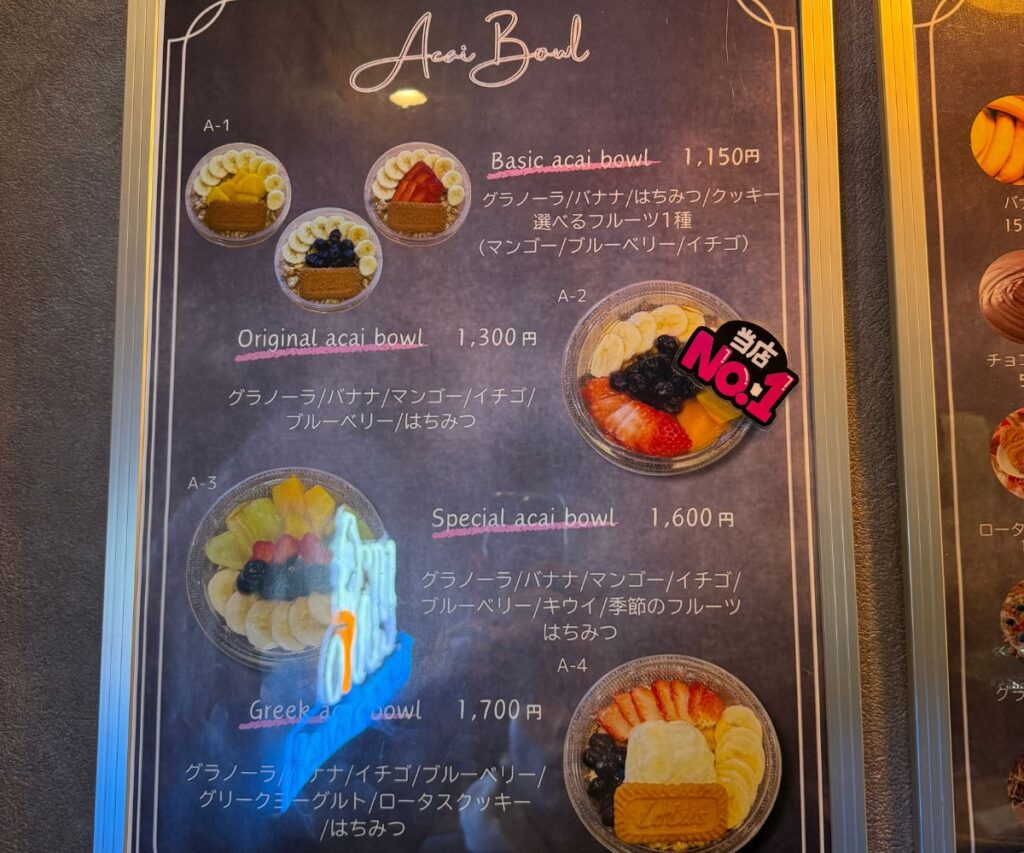 店内ではアサイーボウルやクレープ、ソフトクリームなど、気分に合わせて選べるスイーツが揃っていて、甘いもの好きさんには嬉しいラインナップ。クレープは生地感にもこだわりを感じられて、軽めにもがっつりにも対応できるのがポイント◎